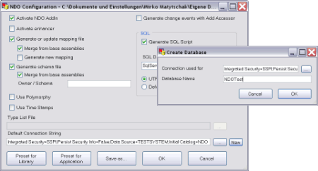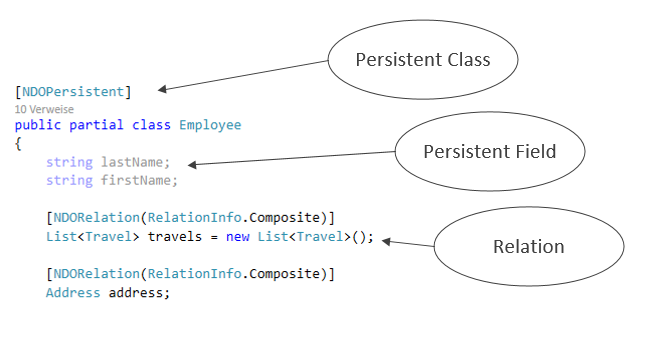 You mark your classes with the [NDOPersistent] attribute. Relations are marked with the [NDORelation] attribute. These are the only two attributes you need for NDO. The NDO Add-in helps you: You can create persistent classes and relationships at the touch of a button on the NDO toolbar in Visual Studio.